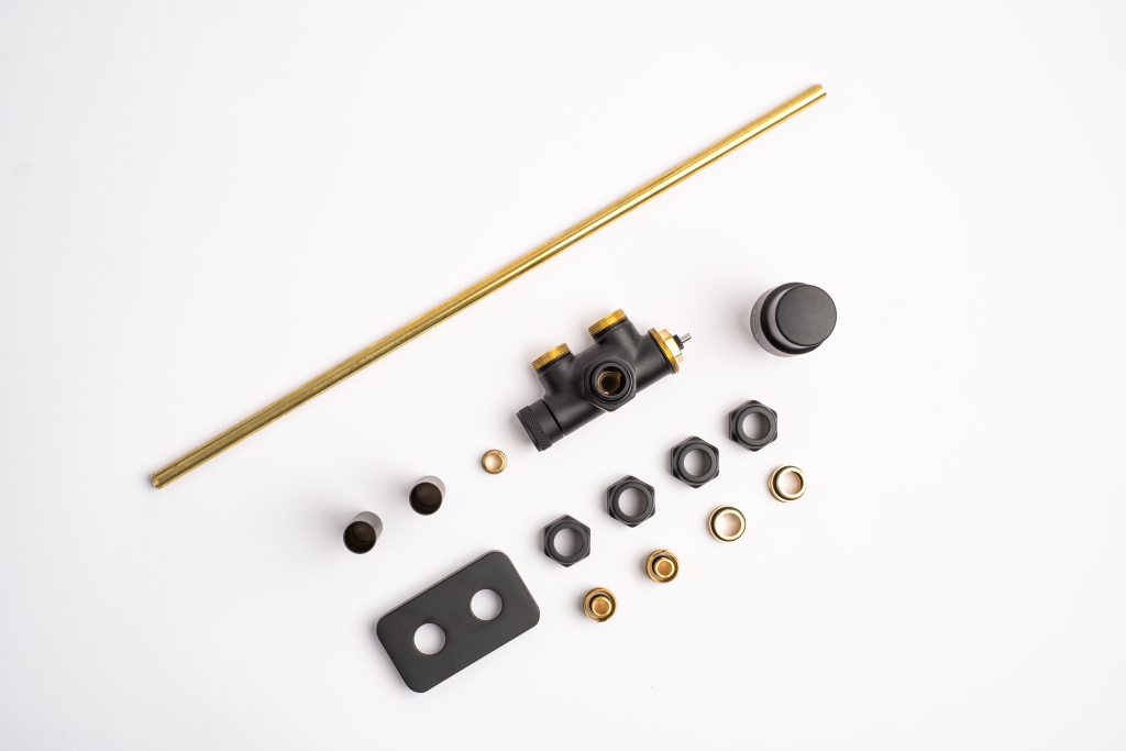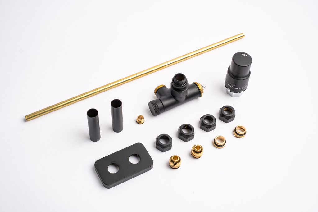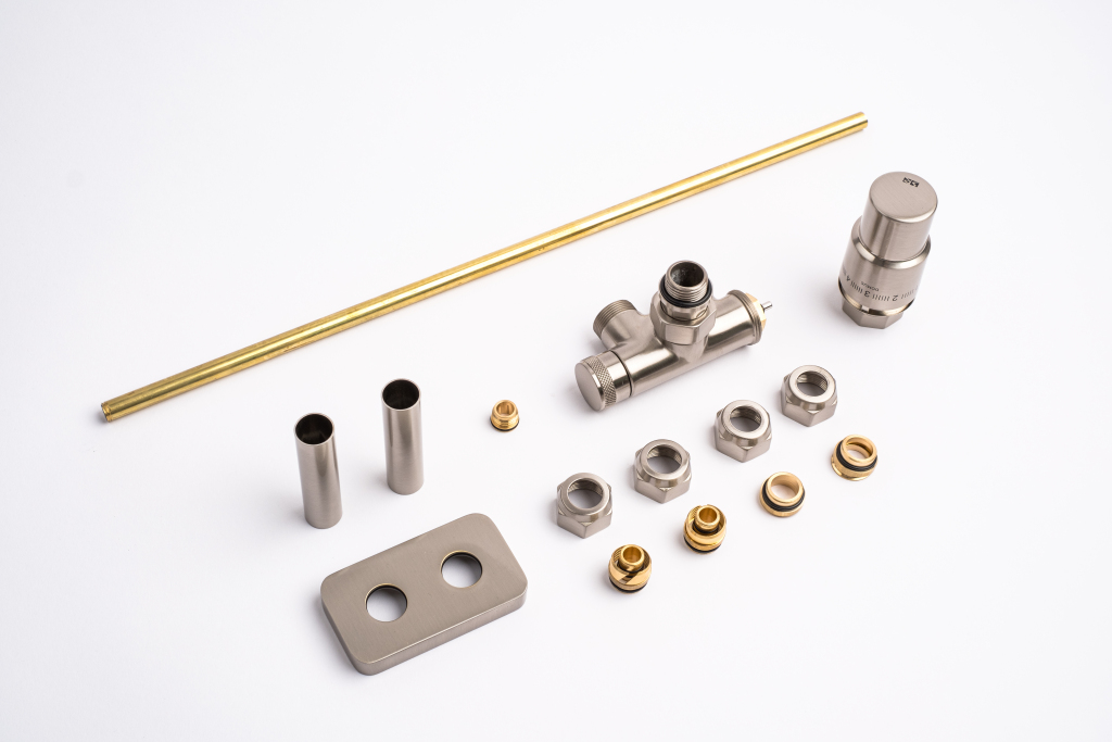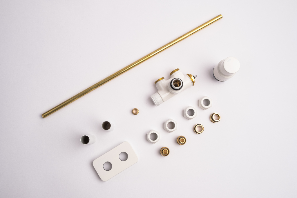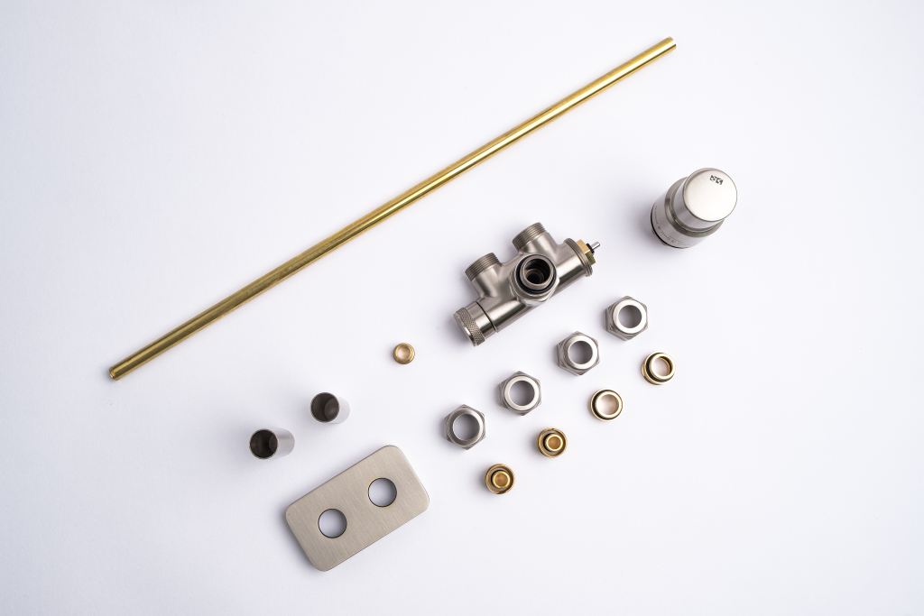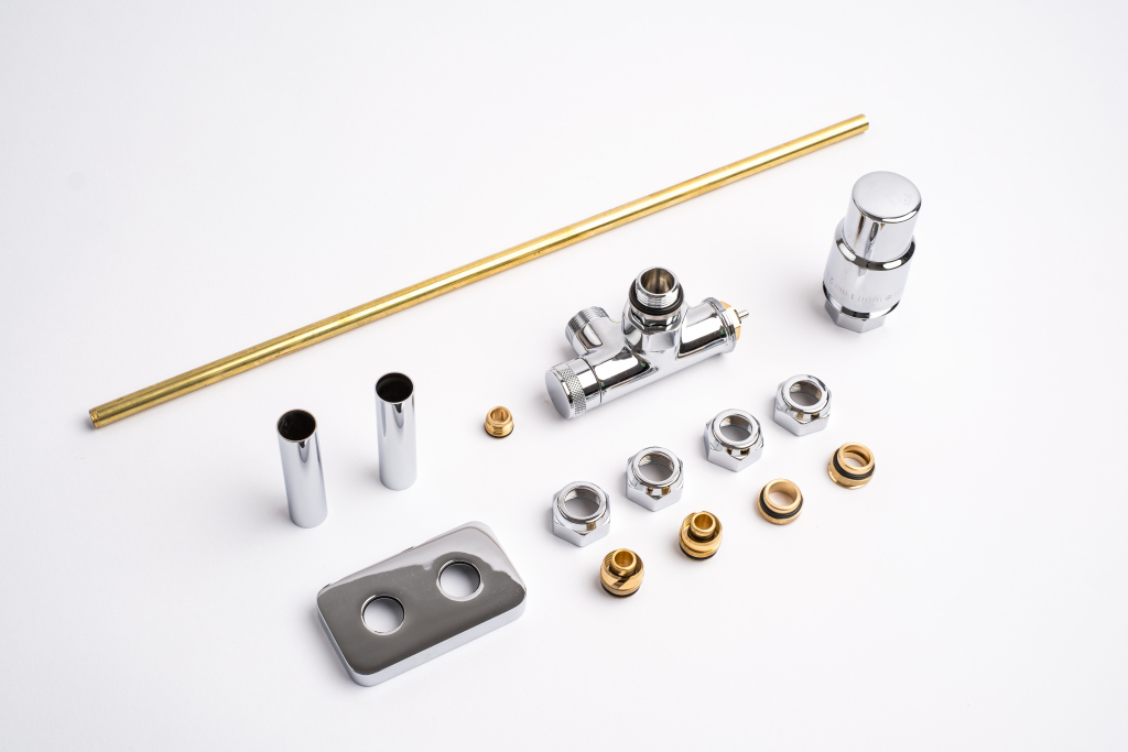 Kompletní sada obsahuje kromě ventilu také krycí rozety a svěrné šroubení pro připojení na měděné potrubí 15 mm a Alupex 16 mm.