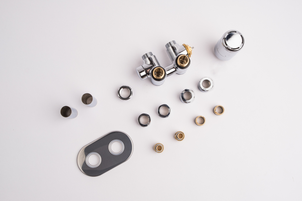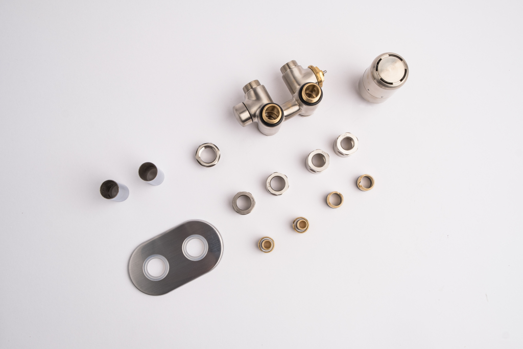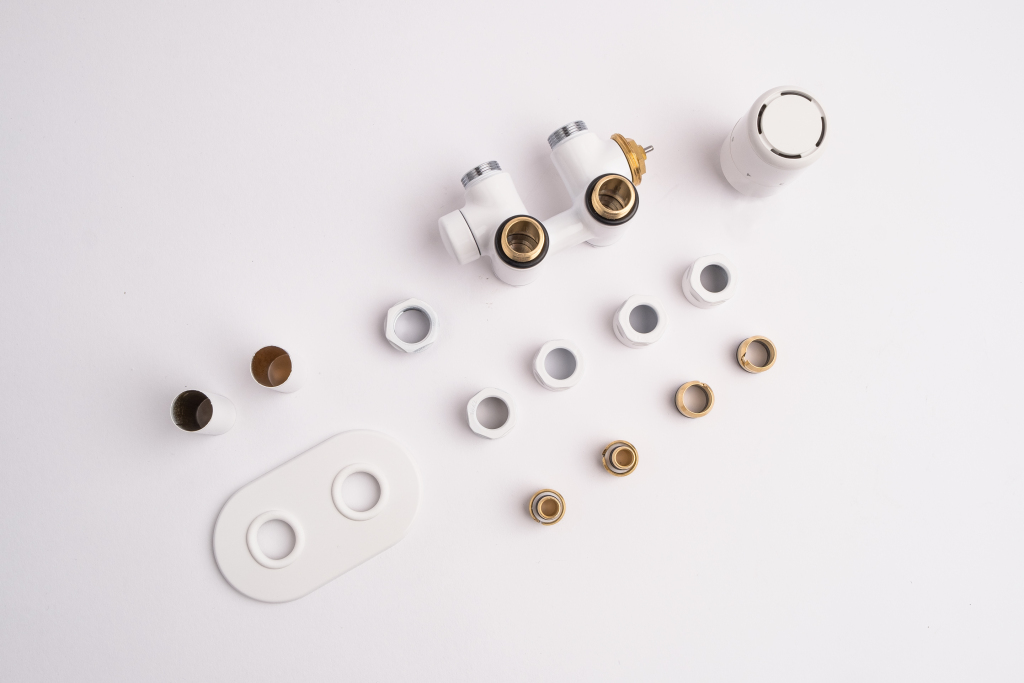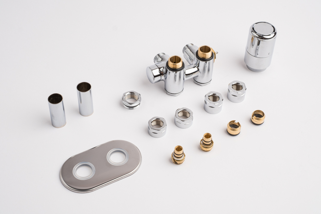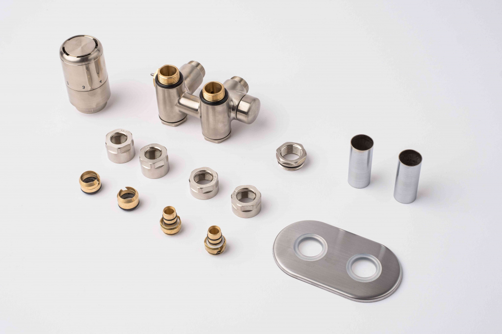 Kompletná sada okrem ventilu obsahuje aj krycie rozety a svorné šróbenie na pripojenie na meď 15 mm a Alupex 16 mm.